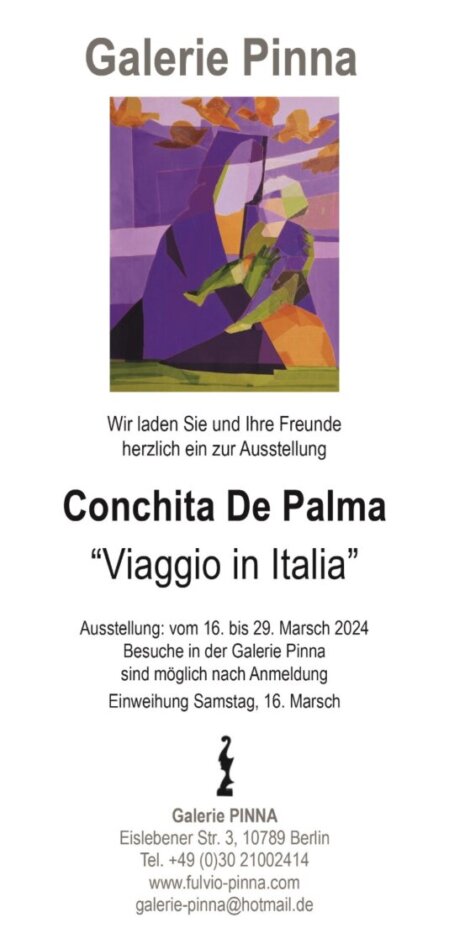 La nostra socia Cochita De Palma è presente con alcune sue recenti opere alla Galleria Pinna di Berlino, nella Mostra collettiva Viaggio in Italia. La Rassegna sarà aperta ai visitatori dal 16 al 29 marzo 2024.
